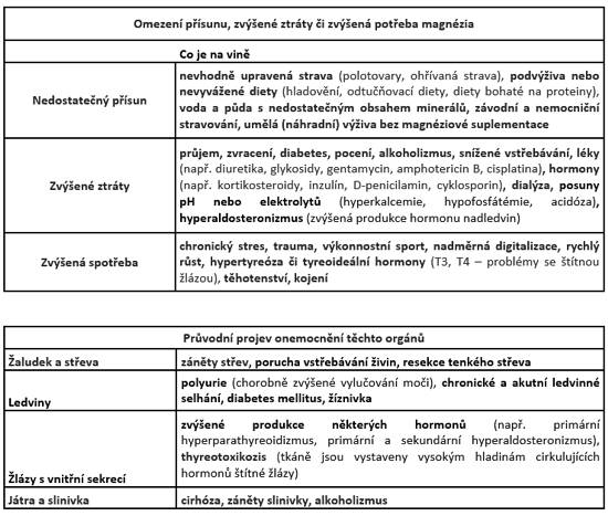 Stavy způsobené nedostatkem magnézia se dělí na dvě skupiny. Do té první patří stavy související s omezením jeho přísunu, zvýšenými ztrátami či zvýšenou potřebou. Do druhé skupiny se řadí průvodní projevy orgánových onemocnění. Podrobnější popis je v tabulkách.