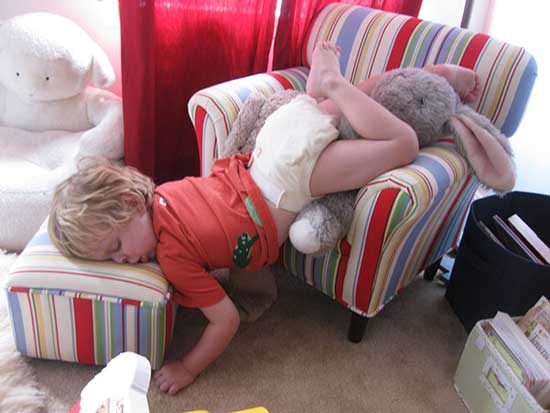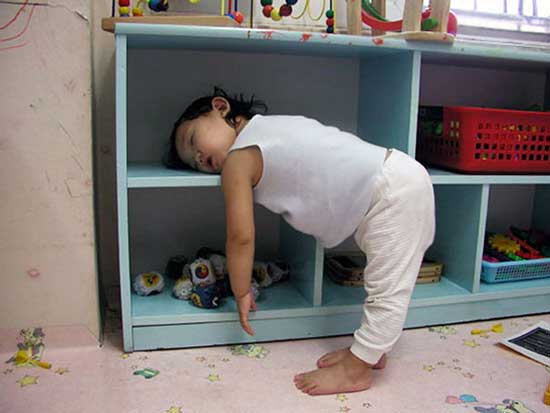 Děti nepřemýšlejí jako dospělí, kde si ustelou. Pokud je příležitost ke spánku, okamžitě ji využijí - často k pobavení svého okolí.