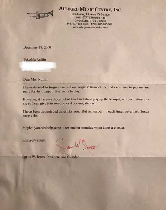 Jaques dodává: "Neměl jsem žádné ponětí o tomto dopisu, dokud jsem jej nenašel na záchodě. Dopis, který byl před mnoha lety adresován mé matce, se dotkl mého srdce a vehnal slzy do mých očí. Uvědomil jsem si, že můj život by byl úplně jiný nebýt laskavosti pana James W. Jonese. Jeho laskavý skutek mi dovolil hrát v kapele na střední i vysoké škole. Tenhle dopis mne inspiroval založit sbírku na gofundme pro podporu studentů, kteří by chtěli hrát na nějaký hudební nástroj, ale finanční situace jim to nedovoluje."