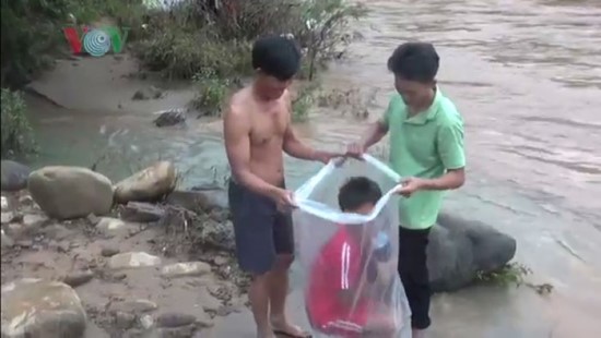 V době deštů je však řeka rozbouřená a přívoz nepoužitelný. Aby se dostaly děti na druhou stranu, musí pomoci místní muži, kteří přetahují všech 50 dětí v igelitových pytlích.