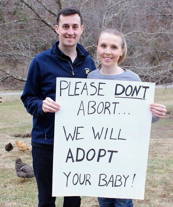 S obrovskou odezvou se setkal příspěvek na Facebooku, který uveřejnil mladý pár z americké Virginie počátkem tohoto roku. Fotka s nápisem "Prosím, nechoďte na potrat... My vaše miminko adoptujeme." Téměř okamžitě získal přes 24 tisíc lajků a byl sdílen více než 87 000 krát. K fotografii byl navíc napsán i dovětek: "Tato nabídka je otevřená na neurčito. Prosím kontaktujte nás, pokud vidíte adopci jako možnost pro vyřešení vaší situace."