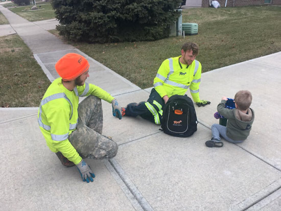 Místní popeláři přinesli chlapci, který je obdivuje, hračku - popelářské auto