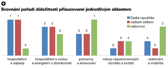 Názory na důležitost jednotlivých oblastí pro dosažení udržitelnosti se u odborníků a respondentů lišily a rozdíly byly také mezi jednotlivými zeměmi. Nejvíce se vnímání spotřebitelů odlišuje od představy odborníků v otázce odpadů. "Hospodaření s odpady je pro Čechy nejdůležitější, ovšem pro odborníky je nejméně podstatné. Cestování a mobilitu klademe obecně na předposlední místo, zatímco pro znalce je to druhý nejdůležitější sektor a jen 19 % našich respondentů s nimi souhlasí," zprostředkovala Hoffmannová závěry studie.