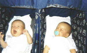 Lukášek - logicky - ten vpravo - hltal tak, že byl najedený během pár minut, spinkal o něco méně, miloval každý nový podnět a podstatně víc se vztekal, ale naopak o dost víc se smál a všechno prožíval. I na té fotce je vidět, že je malinko čilejší.