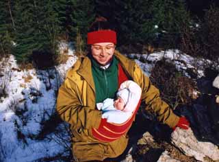 Jenže potom začala být venku zima a já se špatně vešla pod kabát. Teda - ne, že by mne máma nezakryla, ale sama se nemohla pořádně zapnout a byla jí zima. Tak začala vázat „kolíbku 2“, ta se pod kabát schovávala lépe. A navíc jsem zjistila, že z tohoto úvazu se dá báječně koukat, takže jsem trošku omezila spaní a každý den jsem na procházce vydržela o něco déle vzhůru a sledovala dění kolem sebe, i když mi očička padala únavou.