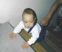 Ondrášek opravdu začal chodit v ukončeném osmém měsíci, v době, kdy Lukášek ještě lezl. Lezl ovšem poměrně rychle a "výchova" a "dovolená" - tedy mateřská, se zvrhla v maratón. Pouhé čtyři místnosti a než je oběhnete s očima navrch hlavy, protože:"Mně NĚKDE řve dítě" - a velice dobře odmalička rozlišíte, které, to je tedy pocit…..Vyzkoušeli jsme také ohrádku, ale jedno dítě chodící podél ohrádky a jedno ve stejném prostoru lezoucí jaksi také nebylo zrovna nic ideálního. Ondrášek přinejmenším vždycky bráškovi stihl něco přišlápnout, nedošlo-li k nejhoršímu a to byl moment, kdy přes bráchu prostě upadl. Když jsem je rozdělila - začal řev. Nakonec tatínek s geniálností sobě vlastní umístil ohrádku do průchodu mezi kuchyní a obývákem, takže už jsem neobíhala místnosti čtyři, nýbrž pouze dvě - kuchyň a chodbu. Bohužel, Ondrášek časem pojal ohrádku jako ideální oporu pro své vycházky a případné lomcování a omlátil kompletně všechny rohy okolní zdi (a ty přihlouplé červené koule v rozích krásně barví). No nic, tatínek prý hrdině "ČASEM" všechno dá do pořádku….. Také tak milujete slovo "ČASEM"?