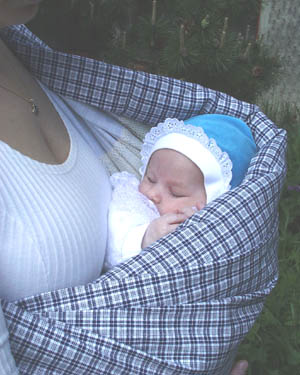 Ocitla jsem se v nečekané situaci. Byla jsem druhý den po porodu se svým chlapečkem v bytě, který byl po nedávném příjezdu do zámoří vybavený jen tím nejnutnějším . Veškeré rodinné a přátelské zázemí se smrsklo na pracovně velmi vytíženého manžela. Hned tento druhý den vzala za své má představa o nenáročných malinkých miminkách, která jen spi a jí, případně se jim sem tam vymění plenky. Syn byl spokojený pouze při kojení. Před naprostým vyčerpáním a chronickým nedostatkem spánku mne zachránila kapitola z knihy THE BABY BOOK ( autor Dr. Sears) [1], ve které jsem se dozvěděla vše podstatné proč a jak miminko nosit. Tak se moje první funkční nosítko stal pruh látky, na kterém jsem udělala důkladný uzel, přehodila přes rameno a boky pokusně do něj uložila našeho křičícího drobečka a vyrazila ven. Bylo úžasné, jak se ihned uklidnil. Nevím kolik kilometrů jsem tenkrát nachodila, ale od té doby jich bylo nepočítaně. Syn přijal vak jako prodloužený pobyt v bříšku. Zpočátku v něm okamžitě usínal ve stejné poloze, na kterou byl zvyklý před narozením. První půl rok jeho života jsme dokonce ani nepotřebovali kočárek. Vak se stal mou nedílnou součástí, bez které jsem si připadala neúplná. Jen ten první popruh látky jsem vyměnila za dokonalejší z obchodu. A pak zažívala báječné chvíle, ve kterých jsem s radostí vysvětlovala nadšenému okolí, kde jsem ke svému sling přišla a jak skvělá věc to vlastně je.