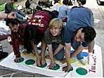 3) Oba hráči musí položit danou končetinu (v tomto případě pravou ruku) na neobsazený kruh dané barvy (červený). Mají-li pravou ruku na červeném kruhu již před vydáním příkazu, musí ji přesunout na jiný červený kruh. Kruh smí být obsazen pouze jednou končetinou jednoho hráče. Pokud jsou všechny kruhy dané barvy obsazené, rozhodčí točí hodinami ještě jednou.