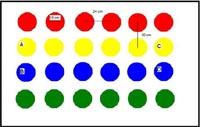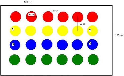 1) První hráč si stoupne jednou nohou na kruh A, druhou nohou na B. Druhý hráč si stoupne na C a D. Stojí čelem proti sobě.