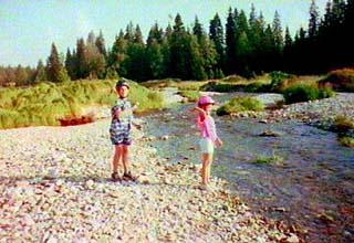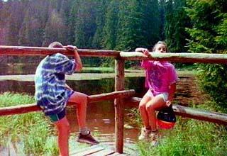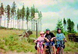 Naše cesta pokračuje dalším stoupáním, pomalu už mi to ani nepřijde divné. Tentokrát je kopec ze všech nejkrpálovitější, navíc se ani nesmíme hnout z cesty, protože všude kolem se nachází původně zaminovaná oblast. Mám radost, protože tady tlačí kolo už i náš tati. A už ani nemluví o ukňouranejch holkách J. Nakonec nás čeká odměna, kopec končí a my sjíždíme strašlivě dlouho až na Javoří Pilu. David riskuje a honí z kopce rekordy, já jenom trnu hrůzou, kdy se někde přizabije. Z Javoří Pily vede odbočka na vrchol Poledník, kde byla nedávno otevřena krásná rozhledna s výhledem na Alpy. Má to malý háček, cesta je pravděpodobně velmi neschůdná, takže je pro cyklisty zakázaná. No, ani nemáme chuť znova stoupat, takže se chvilku šploucháme v Roklanském potoku a potom pokračujeme dál na Modravu.
