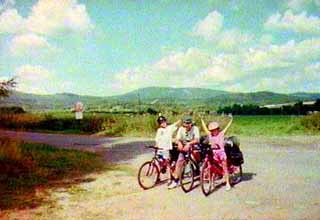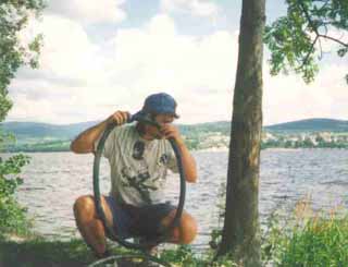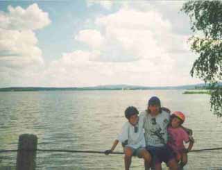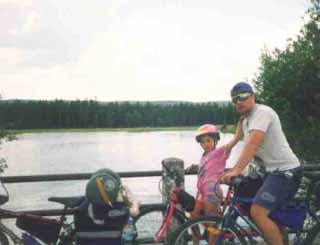 Naše další cesta vede sice stále podle vody, kterou cítíme a vidíme probleskovat mezi stromy, ale my jsme na krásné a pohodlné lesní cestě, schovaní trochu před horkým odpoledním sluncem. Jede se krásně rychle, proto dlouho netrvá a vidíme další přívoz z Předmostí na Frymburk. Odsud už vede dokonce asfaltová silnice, což je trochu zklamání, protože se nám nedotčená a téměř neobydlená krajina líbila víc. Na Přední Výtoni přímo na křižovatce je pěkná hospůdka, kde si dáváme cosi mezi obědem a večeří a potom už po rušné a dosti frekventované silnici sjíždíme pořád podle vody až k přehradní hrázi. Odsud po mírném stoupání vyjíždíme na pravou stranu přehrady, kde začíná soustava kempů. Vybrali jsme si kemp "Pláž", ale vyjde to skoro nastejno, jsou všechny velmi podobné. Cena ještě celkem ujde, ale v tu ránu si připadáme opravdu jako u moře. Davy lidí, především Holanďanů, jejichž soustavy stanů a karavanů připomínají malé hotely, plno aut a značný zmatek a kravál. Děti se okamžitě převlékají do plavek a uhánějí do vody, ale mně připadá ledová, takže je pouze koriguji jako odborný dohled z břehu. Večer na nás čeká teplá sprcha výměnou za desetikorunový žeton a studené pivo výměnou za dvacetikorunovou minci. Moc se mi tu nelíbí…