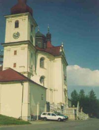 Noční můry ne a ne zaplašit ještě teď, kdy venku svítí slunce a na paloučku před stanem je útulně a příjemně. Sluníčko hřeje a taťka - jak je již jeho zvykem - mi strhává stan nad hlavou, protože jinak by mě prý nedonutil vstávat. Nemůžu za to, že on je vzhůru ještě za tmy a já bych ráda chrupkala právě takhle po ránu. Tím spíš, že v noci jsem skoro oka nezamhouřila. Chystám tedy snídani, jejímž hlavním bodem je poměrně studené (v noci bylo chladno) domácí mléko ze včerejší farmy. Je opravdu hutné a plnotučné a naše sídlištní - krabicemi odkojená - holčička se nad ním ofrňuje. Zvyk je vskutku železná košile. Vydáváme se na cestu okolo desáté dopoledne a trošku posmutněle se ohlížíme na Novohradské Hory, kterými jsme jenom prosvištěli a ani si je pořádně nevychutnali. Cesta před námi je plná překvapení. Vede totiž dolů. Už vesnička Hojná Voda, na jejímž kraji jsme nocovali, je tak nějak z kopce. Zaujala nás vyhlídka u kostela nebo snad kláštera.