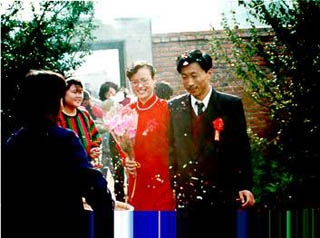 Cestu k domů ženicha zdolávaly družičky ještě před nedávnem na kolech, nevěsta pak na vyzdobených nosítkách, dnes patří ke svatbě luxusní automobil s červenými stuhami, honosnost a luxus svatebního dne přináší štěstí do manželského života. Na fotce kráčí Li se svým nastávajícím od vozu k domu, vítají ji všichni příbuzní jejího ženicha, jedna z jeho tet rozhazuje konfety. Li má šaty v tradiční svatební barvě, tou je červená, barva štěstí a hojnosti, bílá je prý barva smuteční a nenosí se na svatbách, nýbrž na pohřbech. Před vstupem do domů se snoubenci postaví celém k sobě a ukloní se nejprve nebi, pak zemí, poté rodičům a nakonec sobě navzájem. Ale ceremonie to prý není nijak vážná, jak by se mohlo zdát, ve chvíli vzájemného úklonu je často někdo z příbuzných popadne tak, že snoubenci naráží jeden druhému do čela a vyvolají tak v řadách příbuzných salvy smíchu. I následující dění je prý velmi živelné a veselé, nevěsta se totiž snaží vstoupit dveřmi do domu, ale všichni ženichovi příbuzní ji v tom brání, pomáhají ji pouze její družičky. Dveřní rámy bývají obložený červenou látkou s černé napsanými čínskými slovy, dobrými slovy, jak říká Li: štěstí, dlouhý život, hojnost, láska. Nevěstě se to pokaždé nakonec podaří a uvnitř domů již následuje slavnostní hostina. Novomanželé začínají symbolickým okušením tradiční nudlové polévky, nudle je ale v každé misce pouze jedna a to velmi, velmi dlouhá, symbolizující dlouhý život. Pro štěstí stačí jen jediné sousto. A pak se již všichni přítomni pustí do hodování, povídání, veselí. Někdy v průběhu dne přijímají novomanželé svatební dary, to jsou výlučně peníze od nejbližších členů ženichovy rodiny. Novomanželé před každým z nich pokleknou na kolena, ukloní se až k zemí a přijmou peněžitý dar. A to je vše, svatba v Čině se tedy obejde bez manželských slibu, ať formálních či neformálních, a v "porevoluční Čině" i bez snubních prstýnků, které prý nyní prožívají svou renesanci.