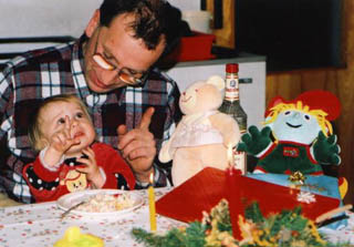 Verunka dostala dřevěné puzzle se zvířátky pro nejmenší a Ježíšek tím na nás upletl pěkný bič. Do půlnoci (a potom pětadvacátého a šestadvacátého a sedmadvacátého a... ) si s ním hrála a my jí při tom museli pomáhat. Nejradši má pohádku, jak opice Chlupatice dává pusinku žirafě Dlouhokrké a ta pusinkuje mrože Antoše, který miluje krokodýla Jeronýma a všichni společně pusinkují Verunku, a ta jim to oplácí... až jsme všichni oslintaní a za velkého křiku se můžeme jít umýt. Pohádka je natolik myšlenkově náročná, že po několika dnech neustálého opakování mi z ní už hrabe.