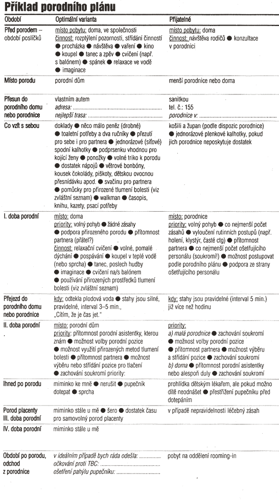 Porodní plán by měla sestavit nastávající maminka, v ideálním případě společně s partnerem (partnerkou), který ji bude doprovázet. Společně by si měli podrobně popovídat o jednotlivých fázích porodu. Dnes je již na trhu spousta knížek, které popisují jednotlivé etapy porodu jazykem, kterému mohou ženy dobře rozumět. Během porodu mohou nastat chvíle, kdy se bude nastávající maminka cítit slabá, bezmocná, bude mít chuť všeho nechat a bude ochotna kývnout na všechno, co jí jen trochu bude slibovat rychlé ukončení porodu. S odstupem času se pak často objeví pocit selhání. Pocit, že to vlastně chtěla jinak a kdyby ji byl někdo podržel…