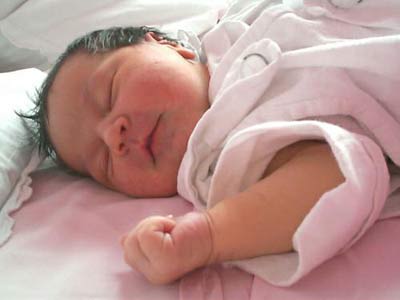 Teď už jsme se konečně rozhodli, jak se naše dcerka bude jmenovat - manžel chtěl Sněženku (fakt má známou, která se tak jmenuje), ale pod tím jménem si já představím křehkou blondýnku. A naše holčička je černovlasý cvalík, tak jakápak Sněženka... I manžel uznal, že našemu miminku prostě sluší jméno Lada :o) Mezitím, co jsem čekala na porod placenty, sestra Ladu ošetřovala a oblékala. Vedle mne, takže jsem ji měla stále na očích, Verunka už si svoji sestřičku taky byla prohlédnout (dokud jsme s manželem byli na porodním pokoji, postaraly se o ní sestry - díky jim za to :o) ) a když už jsem Ladu konečně mohla znova dostat do rukou, tak manžel zneužil výhody pohyblivého a byl rychlejší...