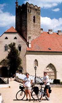 Ráno jsme se v serpentinách, které se kroutí od řeky vzhůru, pěkně zapotily. Zastavujeme v obci Lesná, je tu větrný mlýn, přestavěný na restauraci. Kampak asi vítr odvál časy, kdy tu místo číšníka chodil pantáta mlynář. K Novému Hrádku pokračujeme po lesní cestě, která se mění v kamenitou stezku spíše vhodnou pro turisty nebo nadšence horských kol. Naše trekkingová kola, natož sedací svalstvo, z toho nesrší nadšením. Dojíždíme k hrádku k železným vratům, u nichž je cedule – prohlídka v 10:30 hodin. Konečně se objevil průvodce a začíná perfektní výklad o NP Podyjí, historii hrádku... Z vyhlídky pozorujeme meandrující Dyji. Nenáročným terénem pokračujeme dál směr Znojmo. Je vedro. Chvíli bloudíme v centru a ne a ne se vymotat, tak nevím, jestli jsme značku někde ztratily nebo tu chybí. Kilometry po rovinkách ubíhají rychle.