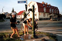 Do Štětína přijíždíme po najetí 422 km čtvrtý den večer. Ač je to škoda, nejedeme do centra, ale hledáme odbočku k hraničnímu přechodu Lubieszyn a už máme pocit, že jsme ji musely minout, protože jedeme Štětínem nějak moc dlouho. Ptáme se kolemjdoucího na cestu, kde máme odbočit. Směrovka nikde žádná. Naviguje nás však špatně, takže se ocitáme místo v Lubieszynu v Kolbaskowu. No nic, někde uhneme. Už je ale dost pozdě večer. Pak děláme neuvěřitelnou věc: uprostřed křižovatky je studna s pumpou, jdu se opláchnout a zjišťuji, že z ní teče úplně horká voda. Tak si tu myjeme i vlasy. Lidi kolem nevěřej!