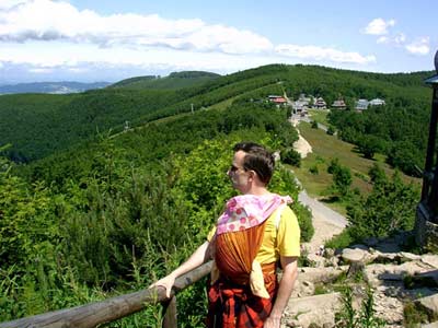 Šátek... je k vzteku, pokud se potřebuju prcka někde "zbavit." Ke svému lékaři chodím s kočárkem, protože potřebuju dítě někde odložit. Hm... teď už spíš postavit. V restauraci se s ním jí přes hlavu dítěte dost špatně. Vyrazit na celodenní výlet do míst, kde není možné dítě na chvíli z šátku vyndat a nechat protáhnout je nejen sebevražda, ale i týrání svěřené osoby. No, chodící dítě bude asi možné odložit kdekoliv, ale zatím to není náš případ.
