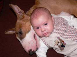V té době a až do října 2005 byla Amča náš milovaný a obletovaný jedináček. Prostě jsme jí měli jako dítě. Tak rozmazleného bulteriéra jste snad ještě nikdy neviděli. Proto taky, když jsem oznámila v rodině, že budeme mít miminko, první otázku, kterou jsem dostala byla: "a co Amča?". Odvětila jsem: "nic, bude z ní chůva". Ani na vteřinku, jsem nezaváhala, že by mohl být nějaký problém. Aminka mé těhotenství vycítila velice brzy. Z rozlítané Amči se stala klidná holka, která mi dříve byla schopná při hře podrazit nohy, ale najednou brzdila a lehala si vedle mne a ne na jako tomu bylo dříve. S rostoucím bříškem si Aminka stále více s oblibou pokládala hlavu na bříško. A ne jednou udiveně zírala na bříško, když jí koplo :o)) Občas mi nebývalo dobře. Amča ležela vždy semnou a vypadalo to, že je ještě v pokročilejším stádiu těhotenství než já :o))