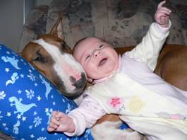 Tady je vidět, jak jsou bulíci mírumilovní. Tak oddaného a milujícího psa jako je bulteriér jsem nikdy neviděla. Proto na otázku bulteriér a kojenec - jde to dohromady, odpovídám: "ano, jde!!!".