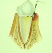 Takhle nějak vypadá parodontitida v počátečním stádiu. Na srovnání máte levou, tedy zdravou část a pravou, tedy nemocnou část. Všimněte si úbytku kosti, také kapsy, kterou měří sonda a zubního kamene, který se pak dostává hlouběji a hlouběji kolem zubu.