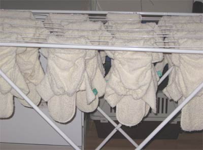 Čtvercové pleny máme i nadále na pusinku, přebalovací pult a schovávanou, ale na chlapečka jsme tedy pořídili plenky froté. Jsou legrační, když jsem je všechny vyprala, vypadalo to tu jako v drůbežárně, posuďte ostatně sami (na té fotce to tak nevynikne, ale opravdu jsme se při příchodu do pokoje lekali:o) Nicméně, jsou funkční. Tedy ne, že by jimi chlapeček nebyl schopen protéct, to on zase umí leccos, ale většinou proteče jen na svrchní kalhotky a dál už ne. No, ledva jsem to dopsala, přesvědčil mě, že mrkvičku umí rozmístit rovnoměrně po všech vrstvách oděvu až téměř do podpaží, a to bez zásahu pacičkama. Ale musel s tím počkat na mrkev, mlíčko tak nebarví, já to chápu:o)