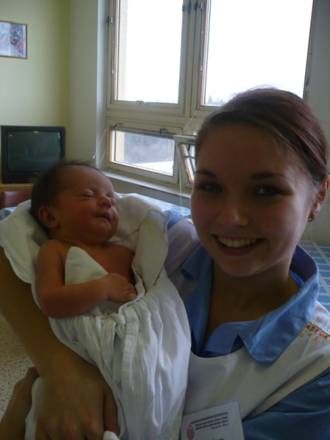 Celou praxi jsme se chtěly jít podívat na porod. Ale zrovna ten den se žádnému prckovi na svět nechtělo. Sestřička nám slíbila, že nás zavolá, jestli se něco objeví. Objevilo. Letěly jsme dolů na porodní sál jako o život. Blížil se už konec praxe, ale chtěly jsme to vidět. Byly jsme docela nervózní a srdce mi bušilo, jako kdybych šla snad rodit já místo doktora. Nakonec nebyl důvod. Přiběhly jsme s křížkem po funuse, bylo po porodu, protože to prý bylo dost rychlé. Miminko bylo na světě a byl to krásný, velký a zdravý kluk. Sestřička ho už ošetřovala ve vedlejší místnosti, tak jsme se tam šly na něj podívat. U ošetřovacího boxu stál dojatý hrdý tatínek, až jsem se skoro dojetím rozbrečela.