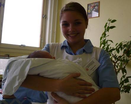 Největší zábava však nastává až na dětské vizitě, kdy svlékáme, vážíme a zase oblékáme jedno miminko po druhém, přebalujeme, asistujeme sestřičce při ošetřování pupeční jizvy a vůbec získáváme zkušenosti pro zacházení s novorozencem. Jak je to nezvyklý ale krásný pocit držet miminko v náručí, učit se ho přebalovat, oblékat, když člověk neví, jak má košilku podložit pod ležící miminko, prostě zážitek a dovednosti na celý život. U jednoho miminka zůstanu nejdéle ze všech. Že bych byla nerada, že maminka nemůže po císařském řezu vstávat a tudíž jí musím natřít miminko zvláčňujícím krémem, přebalit, přičemž dojde ke smolce, jeho první stolici, se opravdu říci nedá. Málem se "ušišlám" a rozplynu nad vrtícím a usmívajícím se miminkem.