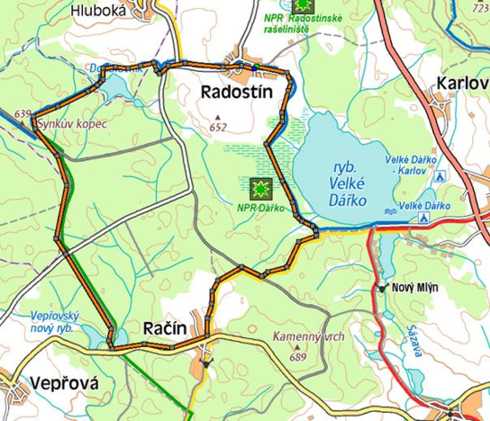 To jsme již dorazili k rozcestí zvanému Padrtiny, kde naše trasa opouští modrou turistickou značku a dále pokračuje vpravo do lesa po žluté. Pravdou je, že samotná vodní plocha do této chvíle prakticky nebyla skrze stromy vidět. Komu tedy přijde líto, že by měl Velké Dářko bez dalšího opustit, může pokračovat po cestě rovně a po necelém kilometru dojde až do kempu a k loděnici. Zpátky se pak vrátí stejnou cestou. Samotná cesta po žluté značce nezačíná nijak optimisticky - jde o nepříliš frekventovanou pěšinku kličkující mezi stromy, po níž musíme s kočárkem překonat nespočet kořenů. Pokud nás neodradí ani tyto útrapy o délce cca jednoho kilometru, vyjdeme na asfaltovanou silničku, na níž se dáme vpravo, abychom po chvilce odbočili vlevo opět do lesa. Zde již vede poměrně přátelštější cesta, která nás vyvede z lesa a pokračuje polním úvozem až do obce Račín. Obcí prochází silnice, po které se dáme vpravo směrem k Novému rybníku. Kilometr chůze po okraji silnice není vzhledem k projíždějícím autům příliš atraktivní, ale dá se vydržet - tento úsek lze i obejít po žluté a následně zelené turistické značce, je to ale zacházka, navíc co se týče terénu, tak trochu do neznáma (autoři nezkoušeli). U rybníka odbočíme na zelenou značku vpravo a po asfaltované lesní cestě mírně stoupáme vzhůru přes Žlábek až na rozcestí Synkův kopec. Zde odbočíme doprava na modrou značku, která vede dolů lesní pěšinou (o poznání pohodlnější než na začátku trasy) až na hráz k rybníku s názvem Doubravník. Na cestu vedoucí po hrázi může být obtížnější nájezd, v tom jsme ale již dostatečně vytrénovaní. Modrá turistická značka nás vyvede z lesa, rybník dále obchází po sympatické louce a následným krátkým lesním úsekem nás stoupáním přivede na okresní silnici, po níž nás nechá doklopýtat zpátky do Radostína. Úsek po silnici je dlouhý nějakých 800 metrů a naštěstí neoplývá větším provozem automobilů. K parkovišti pak již dojdeme z opačné strany, než kterou jsme je opouštěli.