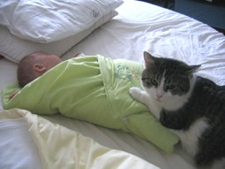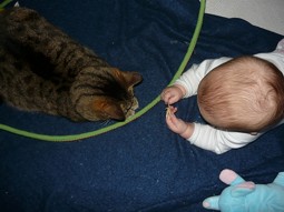 Asi největším strašákem maminek je alergie a epilepsie. Obecně rozšířený názor totiž je, že obé je způsobeno přítomností koček (zvířátek). Já bych na to tedy selským rozumem nazírala obráceně. Dám malý příklad, jak to myslím – i já absolvovala se všemi třemi dětmi nespočet kojeneckých poraden, v prvním roce jsem jezdila k panu doktorovi snad každý měsíc. Občas dostaly očkování nebo přeočkování. Víte, jak funguje očkování? Hezky česky: ve vakcíně je obsaženo trošíčku bacilů a jiných sajrajtů, co způsobují nemoci, proti kterým je dítě očkováno. Jen tak málo, aby si organismus dítěte vytvořil protilátky a až opravdu nemoc udeří, dítě se dovede bránit samo. Může mi teda někdo vysvětlit, jak si má miminko udělat protilátky na alergii, když žije v dezinfikovaných prostorách, pejsků a kočiček se nemůže ani dotknout (nesahej na TO, třeba TO má nějakou nemoc) a každé jablko utržené ze stromu ze zahrádky si musí umýt? V tuhle chvíli je třeba asi říct „méně je někdy více“ nebo snad „všeho moc škodí“? Čili, podle mého (a ehm, jedné studie na internetu) v době, kdy je miminko v bříšku a okolo maminky se ochomejtá jedna nebo dvě kočičky (nebo tři, nebo čtyři :-)), automaticky se vytváří návyk na alergeny, které jsou po narození miminka už neškodné. U nás to tak funguje a jsem za to moc šťastná. Moje známá (nemůže to být kamarádka, nemáme žádné společné zájmy) čeká třetí miminko. V předchozích dvou těhotenstvích byl její nejlepší kámoš akorát tak Bref a z její podlahy by se dalo jíst (bez mučení se přiznám, že tohle u nás opravdu nehrozí :-) Prase ale taky nejsem :-)) Teď se dívá na to, jak si její desetiletý syn docela samozřejmě píchá sám injekce a inhaluje, protože je těžký alergik a astmatik. Jeho starší brácha je na tom lépe, musí jen občas inhalovat. Přesto známé nic nedošlo a třetí těhotenství jede podle stejného scénáře.