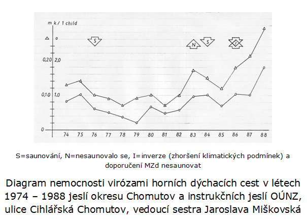 1. Snad pomůže ledaco vysvětlit tento diagram o nemocnosti dětí z jeslí v Chomutově, ve srovnání s nemocností dětí celého okresu. Šlo o onemocnění virózami horních dýchacích cest sledované hezkou řádku let v proslule nepříznivém klimatu podkrušnohorské kotliny. Z diagramu je patrný rozdíl dětí pravidelně saunovaných a dětí bez možnosti saunovat.