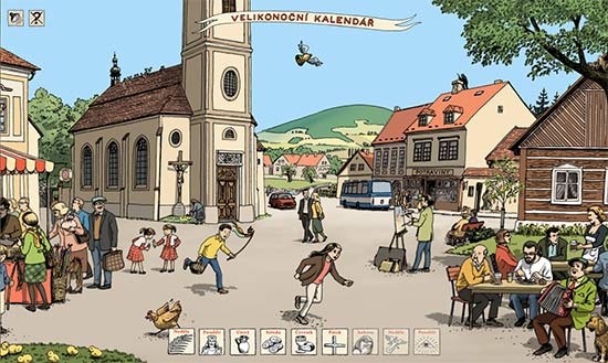 Velikonoční kalendář je pojat jako živý obraz klasické české návsi a pod jednotlivými animacemi ukrývá řadu překvapení. „Letos chystáme šest stálých aktivit. Například ve Velikonoční kronice se bude den po dni odkrývat křesťanský pašijový příběh doprovázený obrázky výtvarnice Lucie Lomové i ukázkami klasických uměleckých děl, která se k němu vztahují. Velikonoční tradičník zase dětem popíše nejčastější velikonoční zvyky,“ popisuje vedoucí dětského webu Štěpánka Sunková.