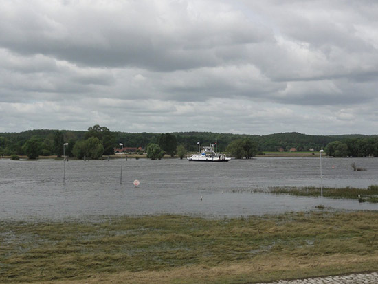 Teprve tady ale poprvé naplno vidíme rozsah letošních povodní! Řeka je rozlitá až k protipovodňovému valu, to znamená několik stovek metrů. Pod vodou jsou louky a keře, jenom stromy trčí nad hladinu. Vypadá to smutně. Ale je to tak správně, toto území je na záplavy připravené a nebýt protipovodňových hrází, které jsou po obou stranách řeky, nedala by se kvůli častým záplavám obývat obrovská plocha podél řeky. Na Odře jsme ale byli zvyklí, že za hrází se směrem k řece dalo nocovat, tady na to můžeme zapomenout. Co není přímo pod vodou, je podmáčené nebo na místech, kde voda dlouho stála, je nocování z důvodu rizika kontaminace nebezpečné. Velká voda může přinést bacily různých chorob, nehledě na to, že to na takovém místě smrdí a množí se komáři! To bude ještě sranda hledat tady noclehy. Naše nadšení z Labské stezky trochu mizí, ale co můžeme dělat, přesunovat se jinam už nebudeme.
