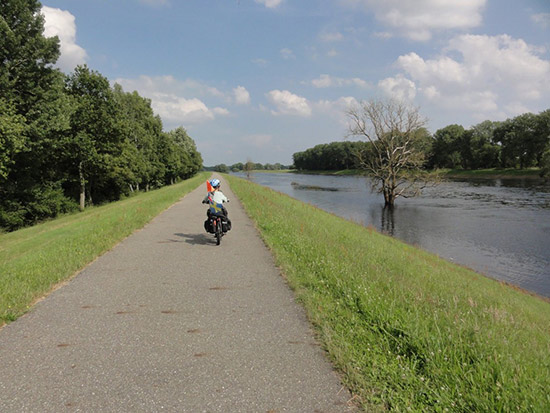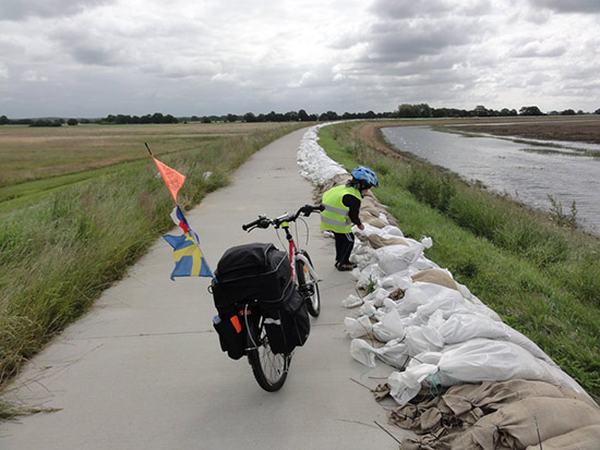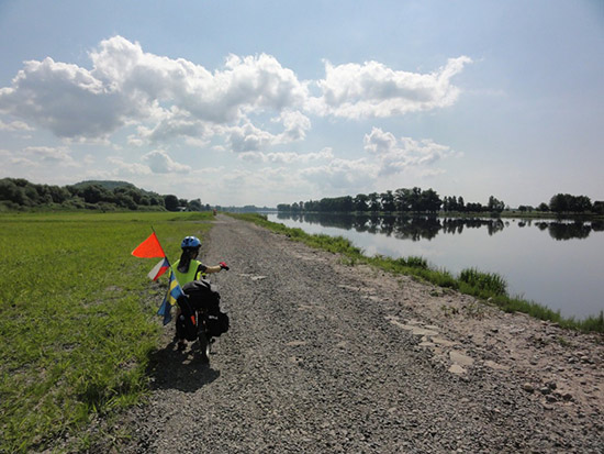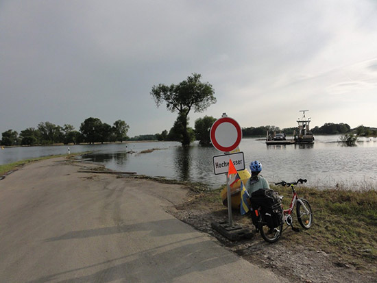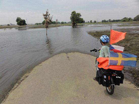 Jedna z mála výhod jízdy po Labské po povodních je absence turistů! Na stezce potkáme občas nějakého místního cyklistu, dálkaři jako jsme my, jsou výjimkou, potkáme tak jednoho denně, někdy ani to ne! Ti asi raději letos vyrazili jinam a tuto stezku si nechali na jindy. Rozlitá voda také oživuje poměrně jednotvárnou cestu podél řeky. Obrázek obrovských lagun a z nich trčících stromů je nezvyklý. Společnost nám navíc dělají protipovodňové zábrany - stovky kilometrů jsou po obou březích Labe vyskládané pytle s pískem. Hráz je vysoká asi 3 metry a těmito pytlíčky ji navýšili o nějakých 40 cm. Denně obdivujeme práci, jakou to dalo, sem vše naskládat! Někde mají písek již uklizený, ale většinou pytle ještě na hrázi zůstávají. Předpověď počasí je totiž stále docela nejistá.