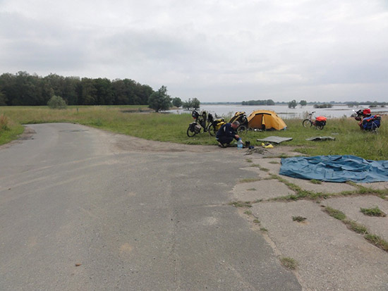 Za městem opět vjíždíme do povodněmi zaneřáděné oblasti - je to síla! Nejen všudypřítomný bordel po vodě, ale také hnusný pach a komáři! A jako na potvoru zrovna v tomhle musíme přenocovat, nedá se jinak! Přímo na hrázi, kde nebyla tráva pod vodou, stavíme za náletů krvežíznivých potvor stan. Děti čekají pod plachtou vozíku, než se jim postaví úkryt a pak padáme všichni dovnitř. Večeříme ve stanu a ráno musím jít na záchod v cyklistickém ponču! Snídáme až později cestou, na tomhle místě se to fakt nedalo!