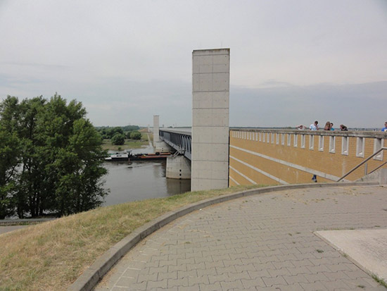Minout mimoúrovňovou vodní křižovatku u Magdeburgu by však byla věčná škoda! Vůbec jsme o ničem takovém nevěděli, normálně si jedeme po cyklostezce, napravo od nás si poklidně plyne řeka … a najednou zjišťujeme, že to není normální řeka, je to řeka, která je na mostě! A Labe si drze protéká pod tím mezi dvěma mostními pilíři, kolmo na tenhle kanál! V letech 1998 - 2003 zde vznikl nejdelší vodní most na světě! Šestnáct ohromných betonových pilířů nese skoro 700 metrů dlouhý ocelový žlab, v němž proudí voda a plavou si lodě - prostě nese nepředstavitelnou váhu! Velmi impozantní podívaná.