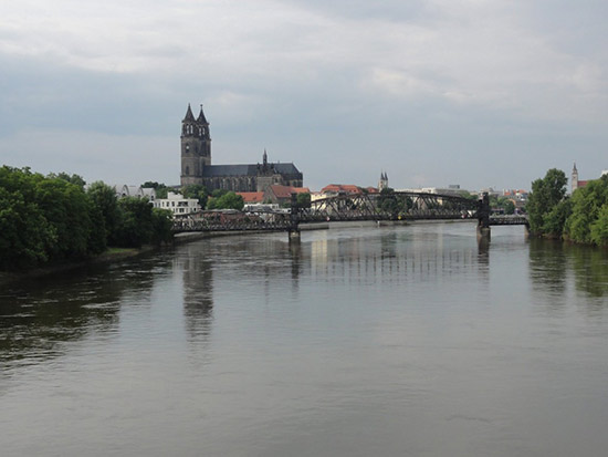 Do Magdeburgu přijíždíme až v půl šesté večer. Normálně nemáme velká města rádi, ale když jedeme po dálkové cykostezce, města nás baví. Máme totiž jistotu, že nás šipečky s éčkem pohodlně provedou centrem, navedou k zajímavostem a pak nás zase bezpečně vyplivnou z města ven. Podobně to je i v Magdeburgu. Stezka vede po nábřeží, odkud vybíhají značené odbočky k místním památkám. Těch tady ale, bohužel, podobně jako ve většině německých měst, po válce mnoho nezůstalo. Ale i tak je Magdeburg příjemné město - chvíli si prohlížíme (i vevnitř) Magdeburskou katedrálu, ta patří k těm starším památkám, a z těch novějších dokola obcházíme architektonicky zajímavou Zelenou Citadelu.