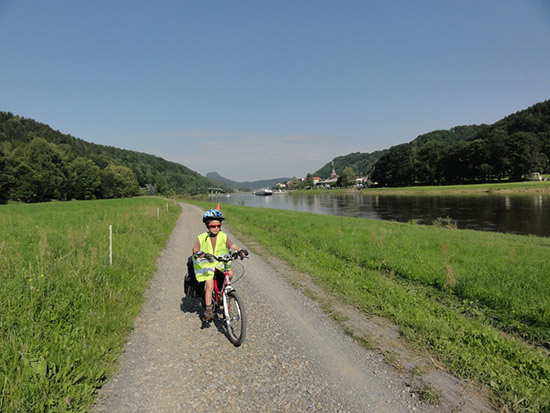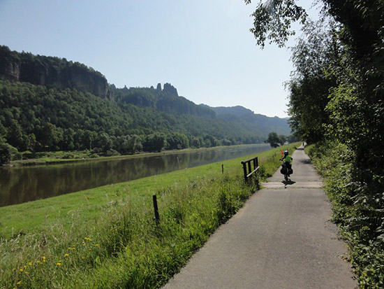 A za Pirnou je konečně klídek. Svahy údolí se zvedají ještě výš a po chvíli nás skály na protějším břehu informují, že vjíždíme do národního parku Česko-Saské Švýcarsko. A najednou je na co se koukat. Sotva nám zmizí z očí vyhlídkový skalní most Basteibrücke s několika oblouky, objeví se před námi 415 metrů vysoká stolová hora Lilienstein, kolem níž se Labe stáčí ohromným obloukem; a na závěr tohoto přírodního divadla máme přímo nad sebou horu s nedobytnou pevností Königstein. Člověk skoro neví, kam jít dřív!
