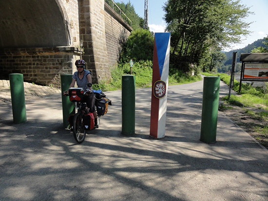 Konečně vidíme na druhém břehu Hřensko, ale na hranici jsou to ještě asi dva kilometry. Děcka si sice všimla české vlajky, ale nějak jsme to okecali, že to ještě Čechy nejsou, že tam přijedeme až zítra. Hned využíváme českou mobilní síť a voláme rodičům, že jsme živí a zdraví v Čechách, a že zkusíme dojet až domů na kolech.