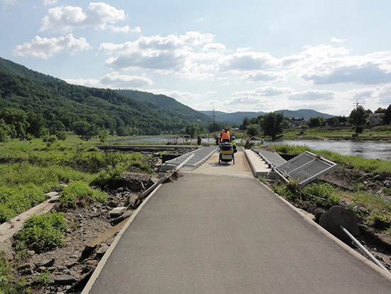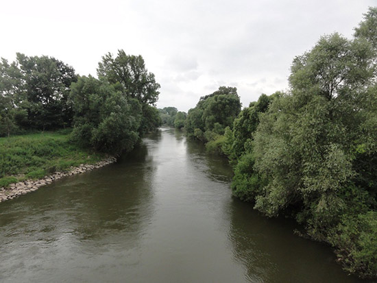 Nyní je na pravém břehu (v našem směru levém) stezka kreslená kopcovitou krajinou po nezpevněné stezce, přejíždíme tedy raději po mostě na druhý břeh a zkoušíme alternativu. Ta vede po povodňové hrázi, přesně tak, jak jsme byli zvyklí na Odře a jak se nám líbí.