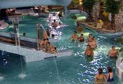 Aquapark je největší a nejnovější atrakcí. Je jediný svého druhu v České republice. Najdete v něm soustavu bazénů, tobogánů a nejrůznějších vodních atrakcí na celkové ploše 5000 m2. Můžete proplouvat romantickými jeskyněmi, dovádět ve vířivkách a vodopádech, umělé řece, vodní houpačce, ohřát se v páře nebo sauně a na soláriu. Pro malé děti je zde malý bazén se skluzavkou. Největšímu zájmu se ale těší soustava 4 tobogánů. Zatímco červený Dráček a žlutá Anakonda jsou spíš pro menší děti, černá Galaxie se světelnými efekty a průjezdem vodní mlhou už vyžaduje větší odvahu. A vůbec nejzajímavější je zcela unikátní modrý tobogán Tornádo, který po prudkém sjezdu a ještě prudší zatáčce ústí do obrovského trychtýře, kterým se po kratší či delší rotaci propadnete do spodního bazénu. V Aquaparku jsou i bufety, kde se za místní měnu - babylonskou babku - můžete pohodlně občerstvit (peníze snadno vyměníte v několika automatech). Vstupné do objektu (všechny další atrakce jsou pak již zdarma) je 140,- Kč pro děti od 100 do 140 cm (menší děti neplatí nic) a 190,- Kč pro všechny ostatní na neomezenou dobu (o víkendu a svátcích je 50,- Kč přirážka).