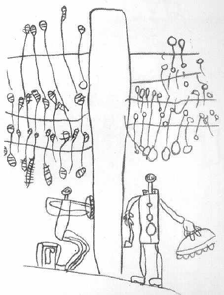 Kácení stromu (5; 2). Pokus o vystižení pohybu figur. Zajímavý je i strom větvící se vždy v pravém úhlu.