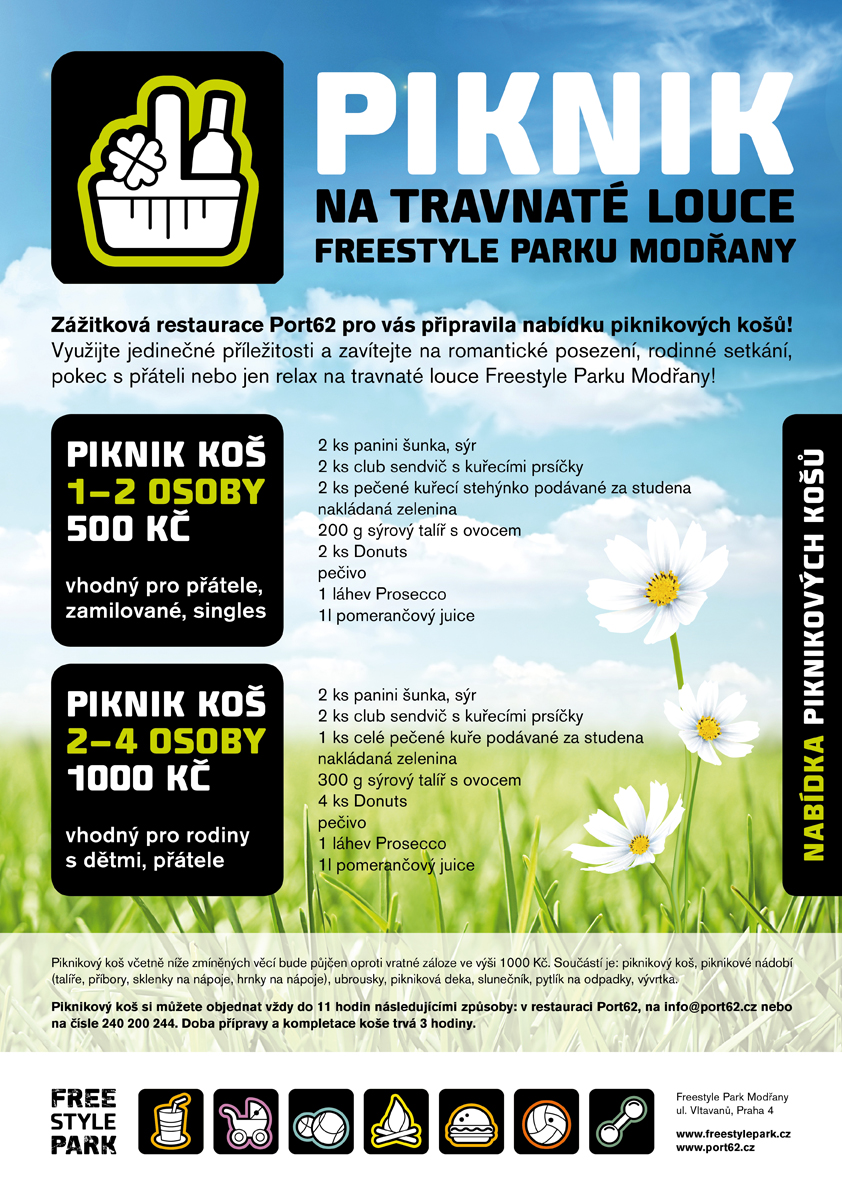 | Popis: | Zážitková restaurace Port 62 v areálu Freestyle Parku Modřany připravila pro letošní sezónu absolutní novinku – piknik. „Využili jsme potenciálu našeho volnočasového areálu a přichystali jsme pro hosty restaurace možnost užít si výtečného jídla ve spojení s přírodou na břehu Vltavy,“ říká mnohonásobně oceněný šéfkuchař restaurace Port 62 Radek Roubíček. Ten se svým týmem připravil dvě varianty piknikových košů, aby uspokojil co nejširší klientelu. Levnější varianta za 500 Kč je ideální pro dvě osoby a zahrnuje: 2ks panini šunka, sýr, 2ks club sendvič s kuřecími prsíčky, 2ks pečené kuřecí stehýnko (podávané za studena), nakládaná zelenina, 200g sýrový talíř s ovocem, 2ks Donuts, pečivo, 1láhev Prosecco, 1l, pomerančový juice. Dražší varianta za 1000 Kč pro 2-4 osoby v sobě skrývá: 2ks panini šunka, sýr, 2ks club sendvič s kuřecími prsíčky, 1ks celé pečené kuře (podávané za studena), nakládaná zelenina, 300g sýroví talíř s ovocem, 4ks Donuts, pečivo, 1 láhev Prosecco, 1l pomerančový juice. Součástí piknikových košů je vždy kompletní piknikové nádobí, ubrousky, pikniková deka, slunečník, pytlík na odpadky a případně i vývrtka. Piknikové koše nutno objednat vždy den dopředu, a to na info@port62 nebo na tel. 240 200 244. |